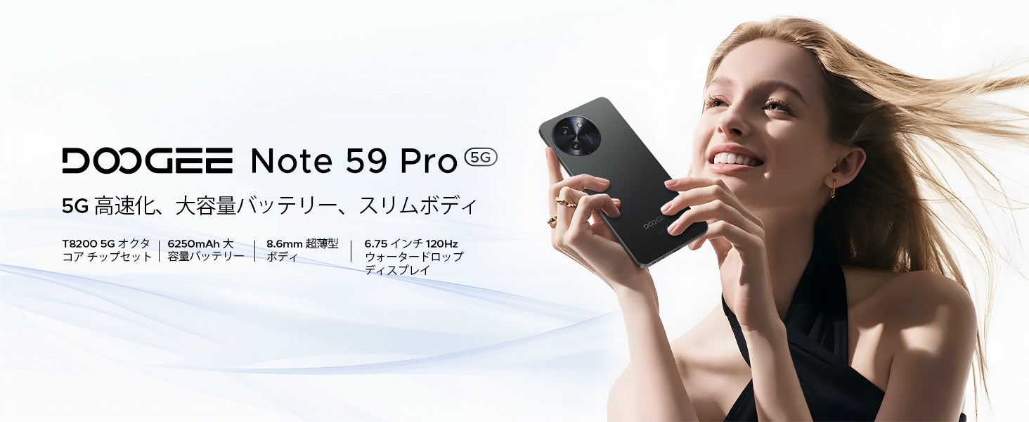 最新5Gスマートフォン「DOOGEE Note59 Pro」登場!Android 15搭載、超大32GBメモリ+256GBストレージ&6250mAhバッテリーで新発売特価23,900円!
