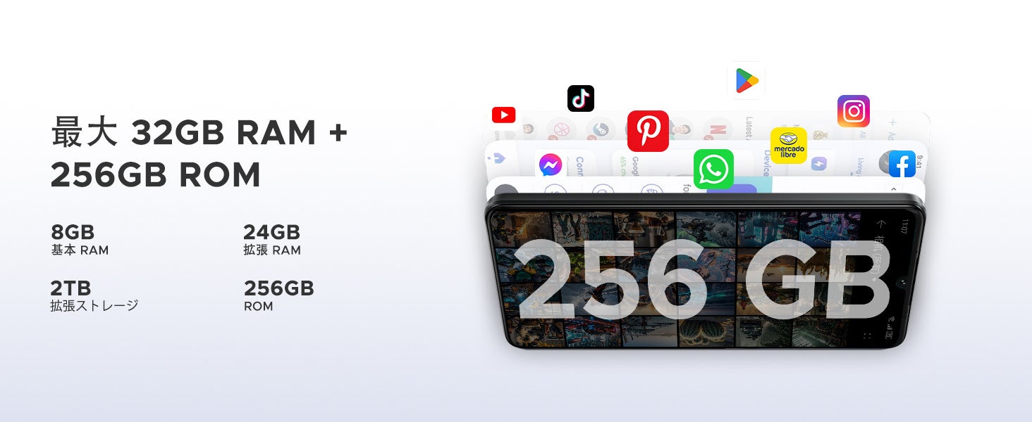 8GBの実メモリに加え、最大24GBの拡張RAM(合計最大32GB)に対応。さらに大容量256GB ROMで、アプリも動画も思いのままに保存可能。最大2TBのmicroSD拡張にも対応します。