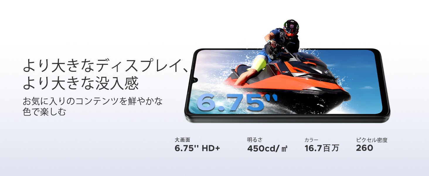 6.75インチHD+のIPS液晶ディスプレイは、120Hzのリフレッシュレートに対応。なめらかな操作感と没入感のある映像体験を提供します。