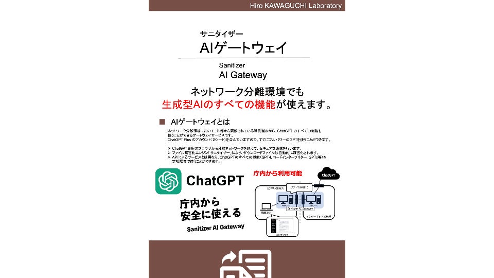 ネットワーク分離環境において、外部から隔離されている職員端末から、ChatGPT等の生成型AIやKintoneなどのクラウドサービスのすべての機能を使うことができるゲートウェイサービスです。