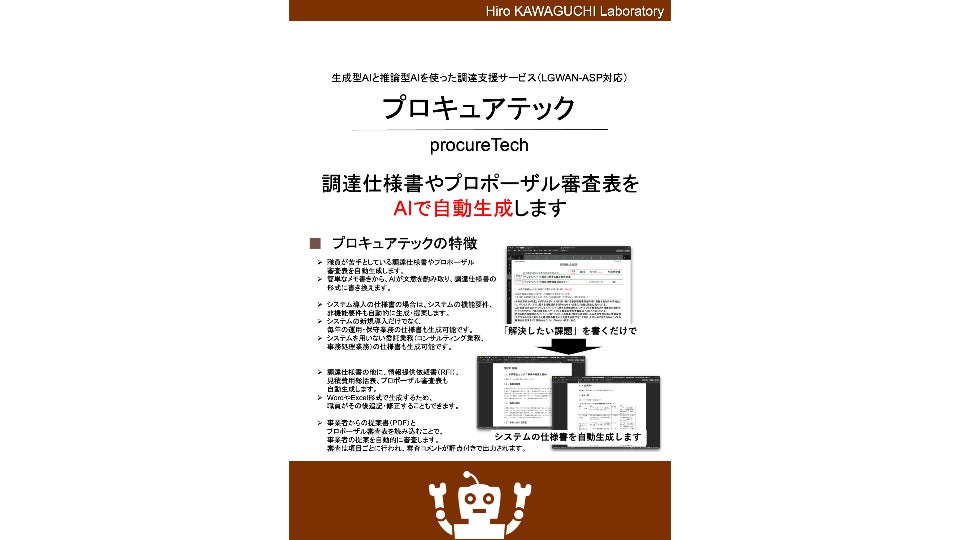 生成型AIと推論型AIを使った、公共機関向けの調達支援サービスです。簡単なメモ書きを元に調達仕様書、RFI(情報提供依頼書)、プロポーザル評価基準などの文書を自動作成します。