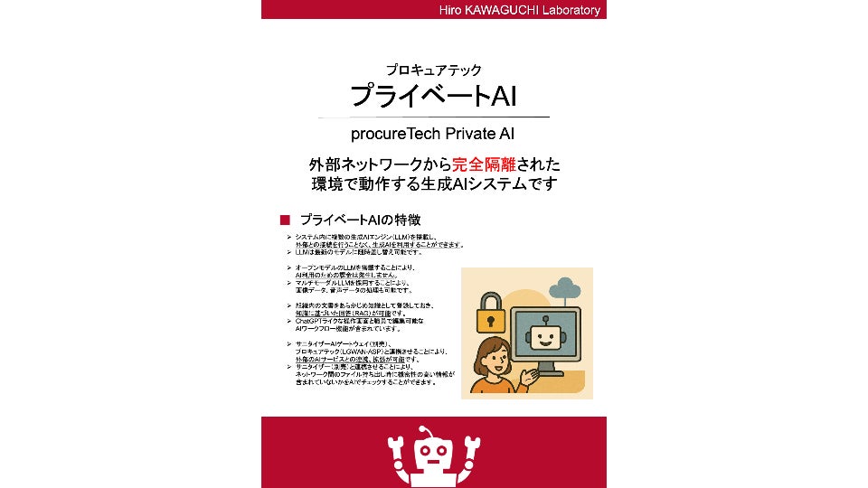 川口弘行合同会社は、電子政府・電子自治体のスペシャリストとして、IT調達支援を中核に自治体DXを推進しています。本展示では、生成型AIを活用した以下の3サービスをデモンストレーション形式でご覧いただけます。
