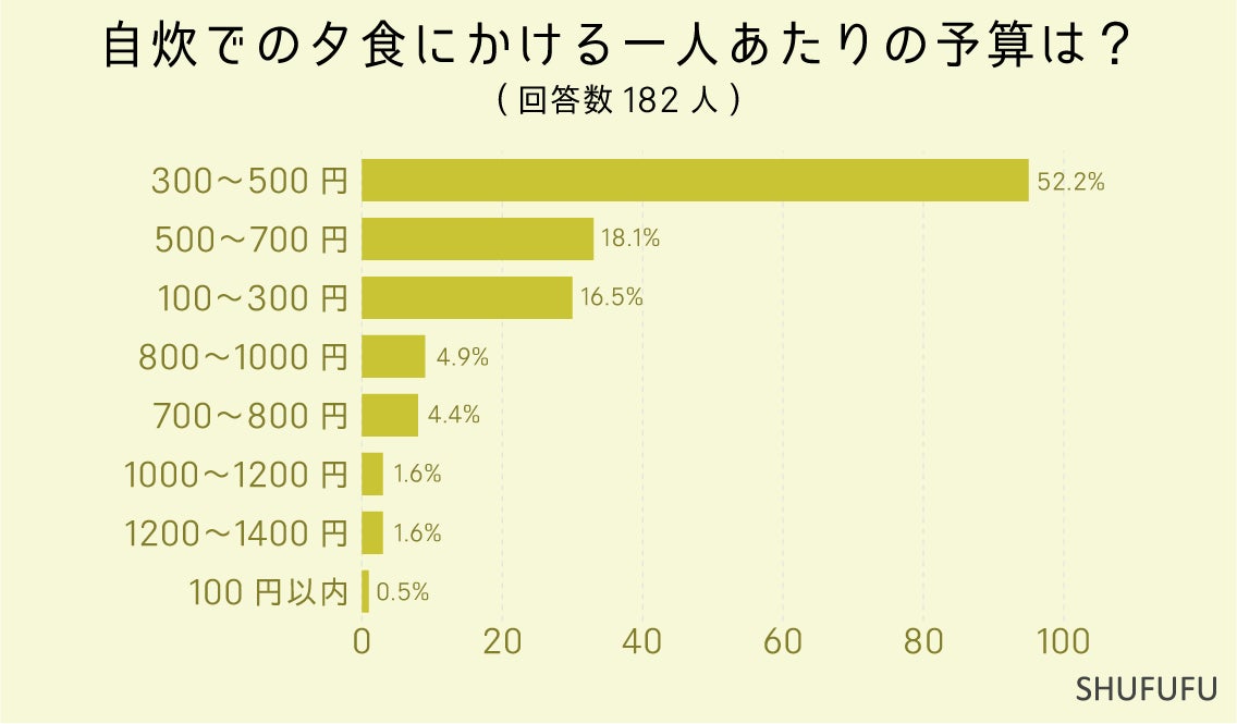 自炊での夕食にかける一人あたりの予算では「300〜500円」が最多でした。2~3人分で1食1000円前後になりますね。