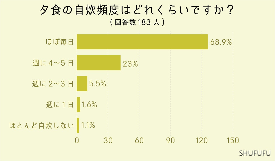 夕食の自炊頻度はどれくらいかですか?の問いに対して最も多かったのが「ほぼ毎日(68.9%)」でした。 次いで「週に4〜5日(23%)」「週に2〜3日(5.5%)」という結果でした。あまり自炊しないという方は少ないようでした。仕事と家事を両立されている方が多いようですね。