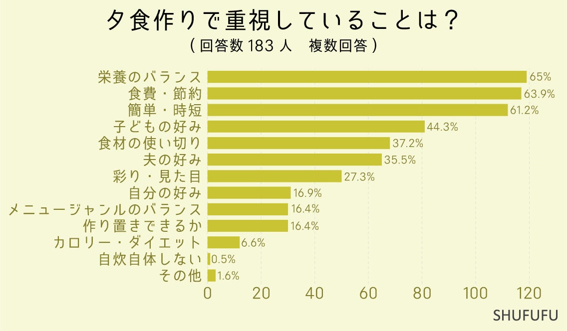 夕食作りで重視していることを尋ねたところ、1位は「栄養のバランス(65%)」、2位「食費・節約(63.9%)」となりました。食費を抑えつつ栄養バランスが偏らないようにメニューを考えるのは大変そうですね。