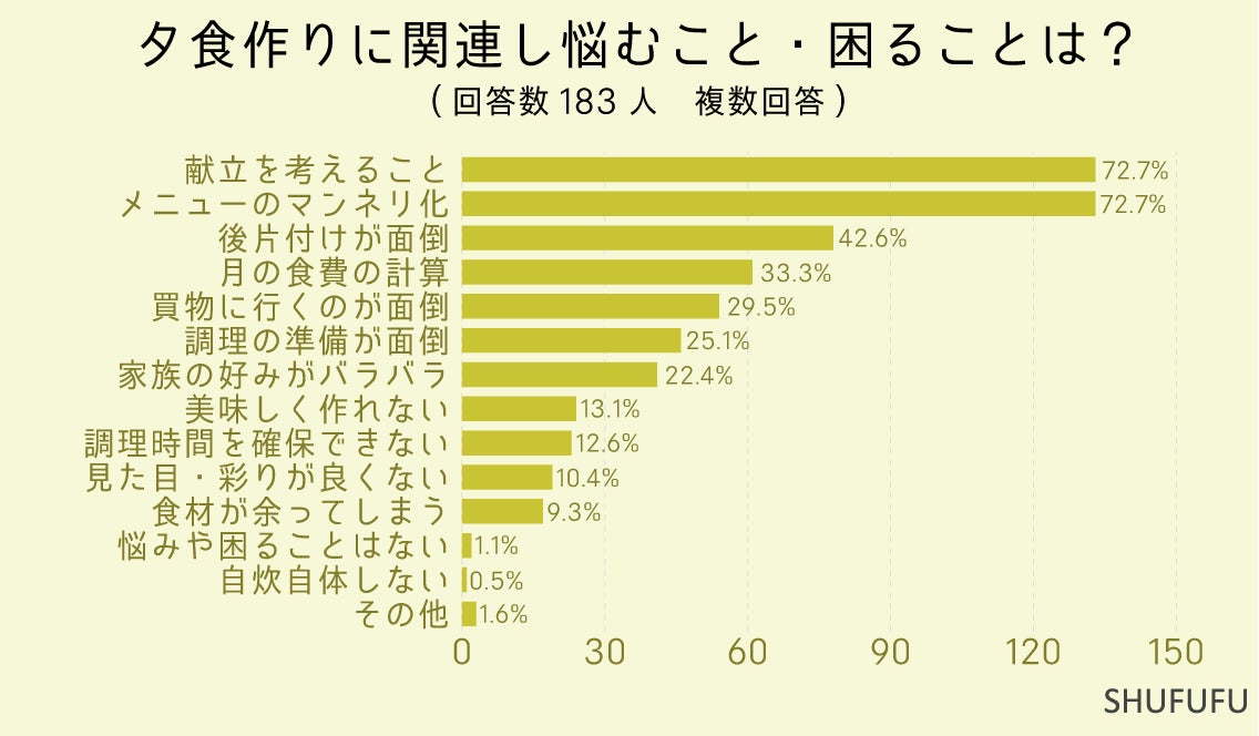 夕食作りに関連し悩むこと・困ることを尋ねたところ、1位は「献立を考えること(72.7%)」、2位「メニューのマンネリ化(72.7%)」となりました。1・2位ともに夕食のメニューに関することでした。どんな夕食を作るかを毎日考えるのは大変ですよね。