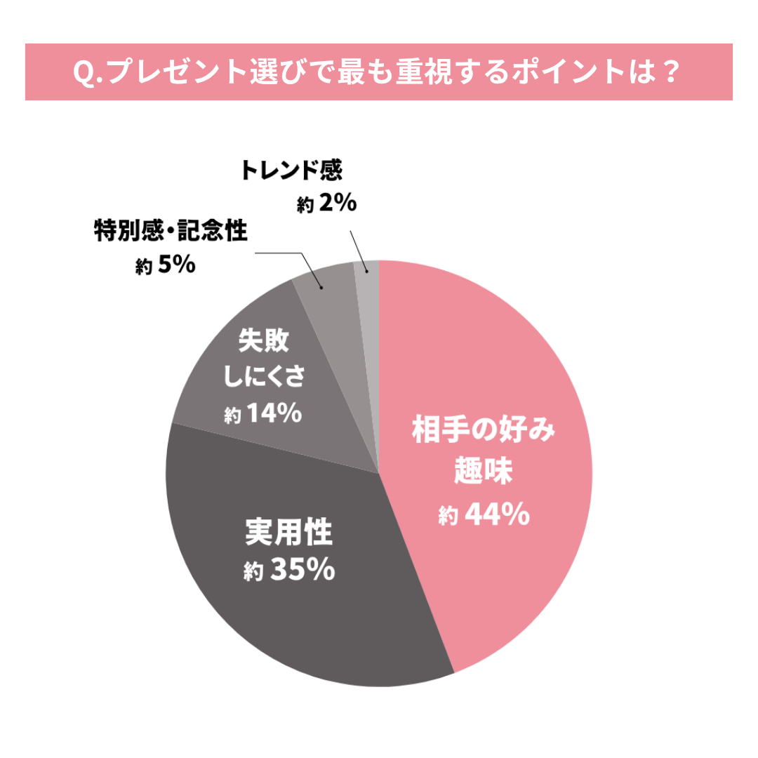 回答者に、「最終的にプレゼントを選ぶとき、最も重視するポイントは?」と質問したところ、「相手の好み・趣味」(約44%)が最も多く、次いで「実用性」(約35%)という結果になりました。