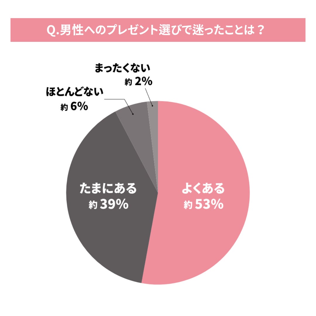 回答者に「男性へのプレゼント選びで、迷ったことはありますか?」を質問したところ、「よくある」(約53%)、「たまにある」(約39%)を合わせると、実に約92%がプレゼント選びに迷った経験があると回答しました。男性向けギフト選びは、多くの人にとって“悩みやすいテーマ”であることが明らかになりました。
