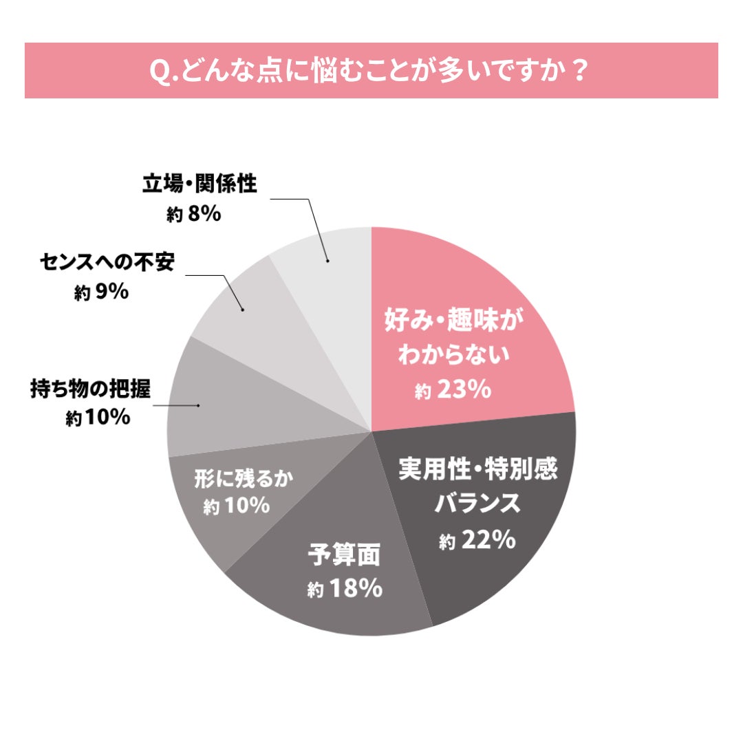 回答者に「プレゼント選びで、どんな点に悩むことが多いですか?」と質問したところ、最も多かったのは「相手の好み・趣味がわからない」(約23%)で、次いで「実用性と特別感のバランス」(約22%)、「予算とのバランス」(約18%)という結果になりました。
