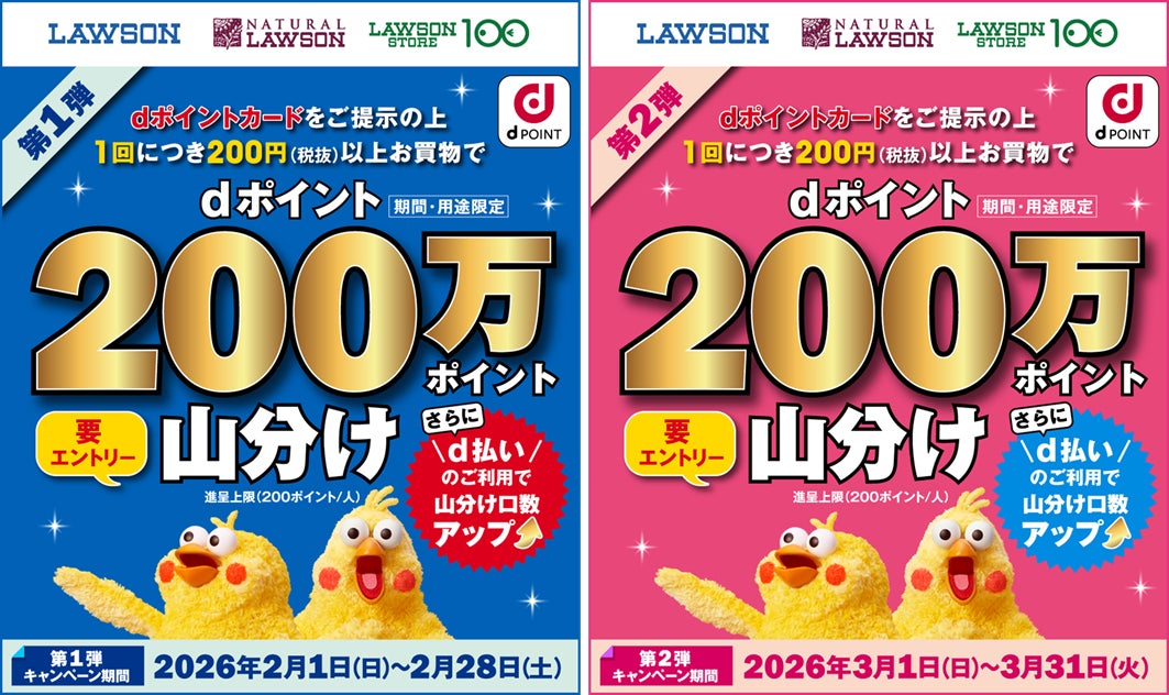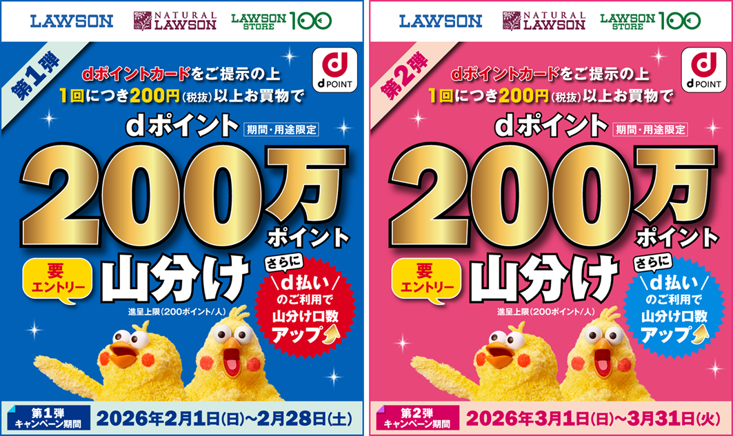 株式会社NTTドコモ(以下、ドコモ)は、ローソン・ナチュラルローソン・ローソンストア100において「【ローソン】dポイント山分けキャンペーン(第1弾・第2弾)(以下、本キャンペーン)」を、2026年2月1日(日)から2026年3月31日(火)までの期間で開催いたします。