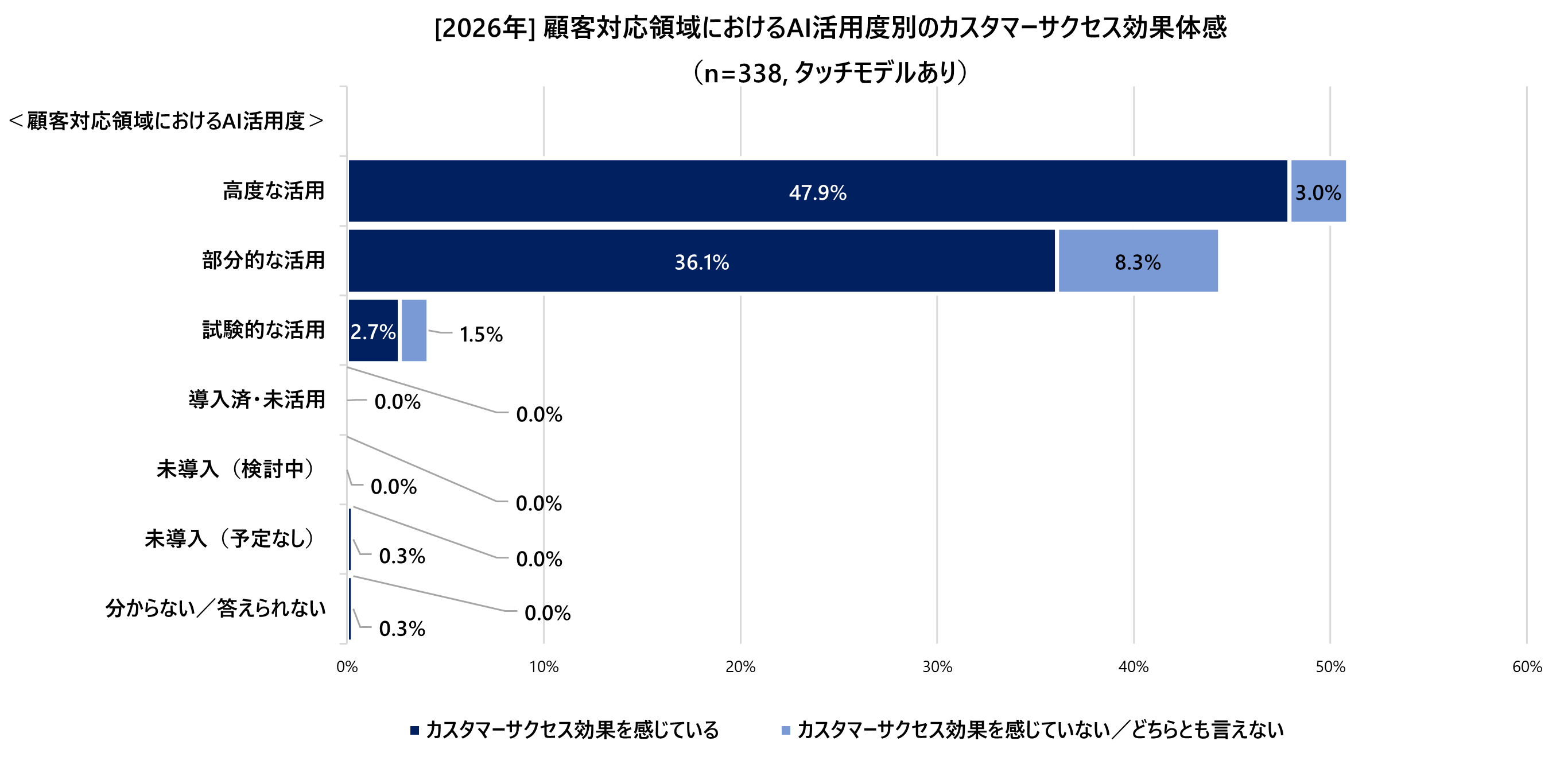 この一連のデータは、AI活用のステップを踏むこと自体が成功を保証するのではなく、どのフェーズにおいても「タッチモデル」という土台が成功確率を劇的に押し上げていることを示しています。AIを確実に業績向上へ結びつけるためには、導入フェーズに合わせた顧客対応の再定義(タッチモデルの構築)が不可欠であると考えられます。