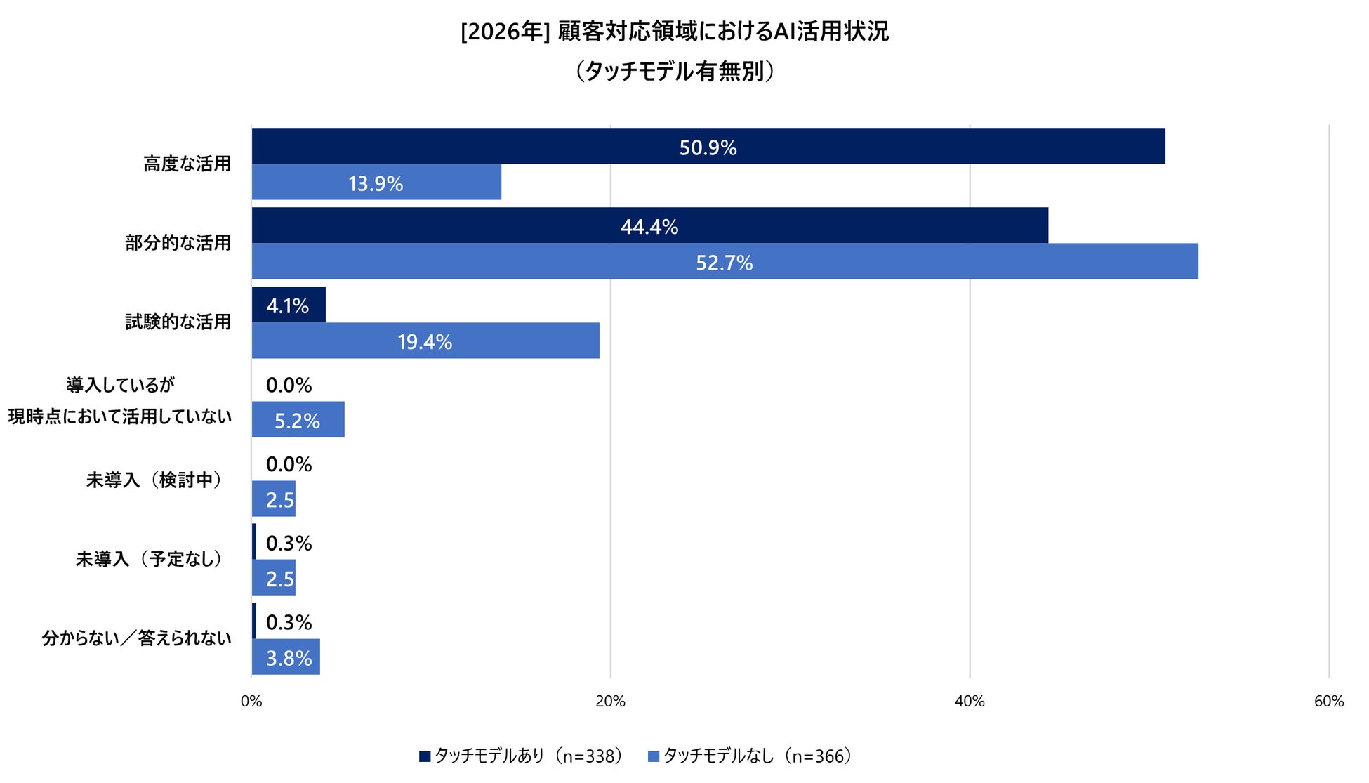 さらに、タッチモデルの有無は、AI活用の進展度合いを決定づける極めて重要な要素であることが明らかになりました。2つの層を比較すると、AI実装の深度において明確な格差が生じています。