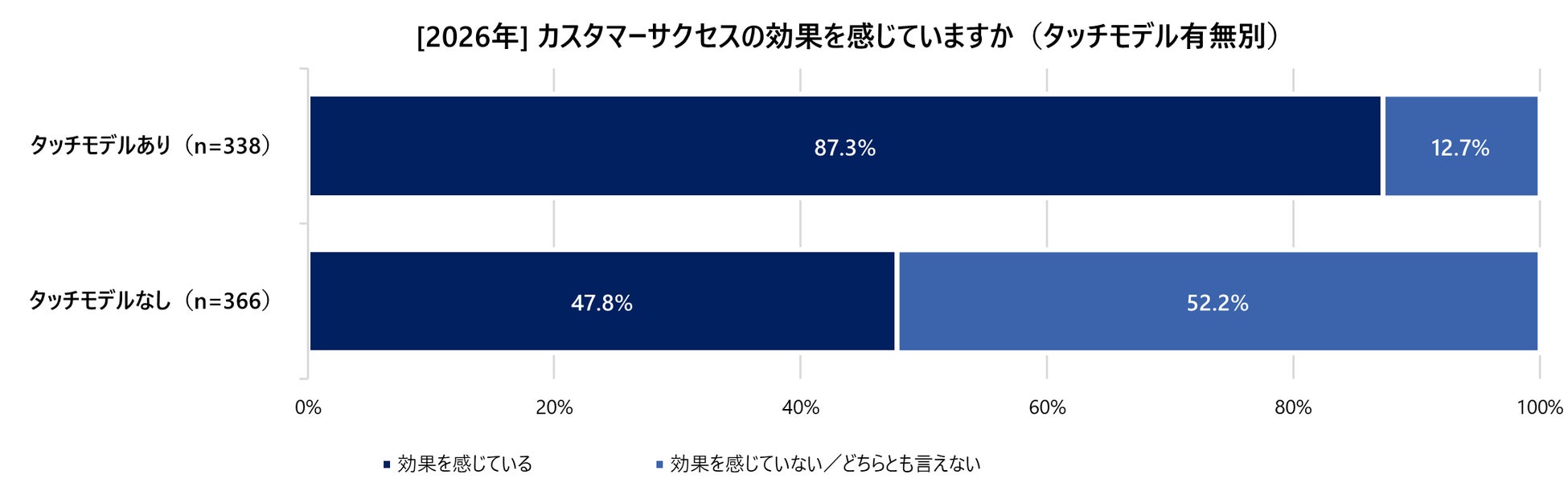 タッチモデルを構築している企業(n=338)では、87.3%がカスタマーサクセスの効果を実感していると回答しました。これに対し、タッチモデルを構築していない企業(n=366)で効果を実感している割合は47.8%にとどまっており、両者の間には約40ポイントもの顕著な格差が生じています。この結果は戦略的なタッチモデルの構築が、主観的な手応えを確かな「成功」へと引き上げるための不可欠な基盤であることを裏付けています。