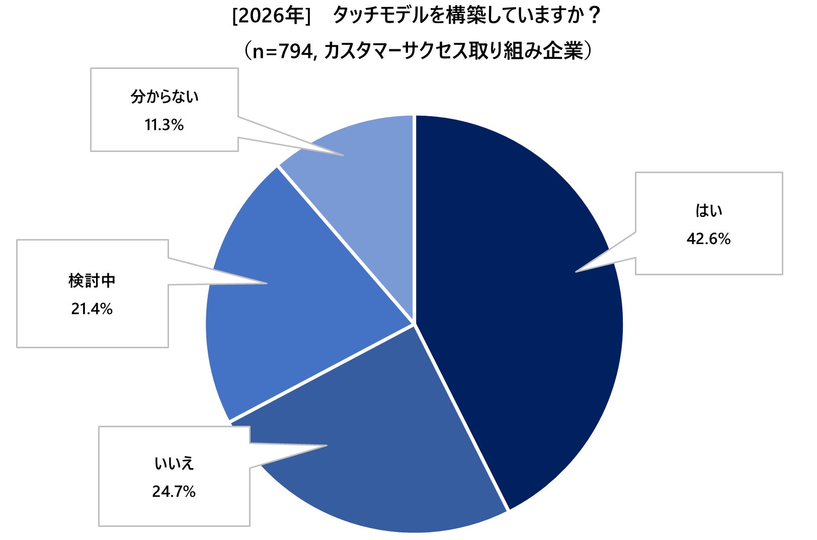 今回の調査において、カスタマーサクセスに取り組んでいるという企業(n=794)に対し、顧客対応設計である「タッチモデル」の構築状況を尋ねたところ、「構築している(はい)」と回答した企業は42.6%にとどまりました。