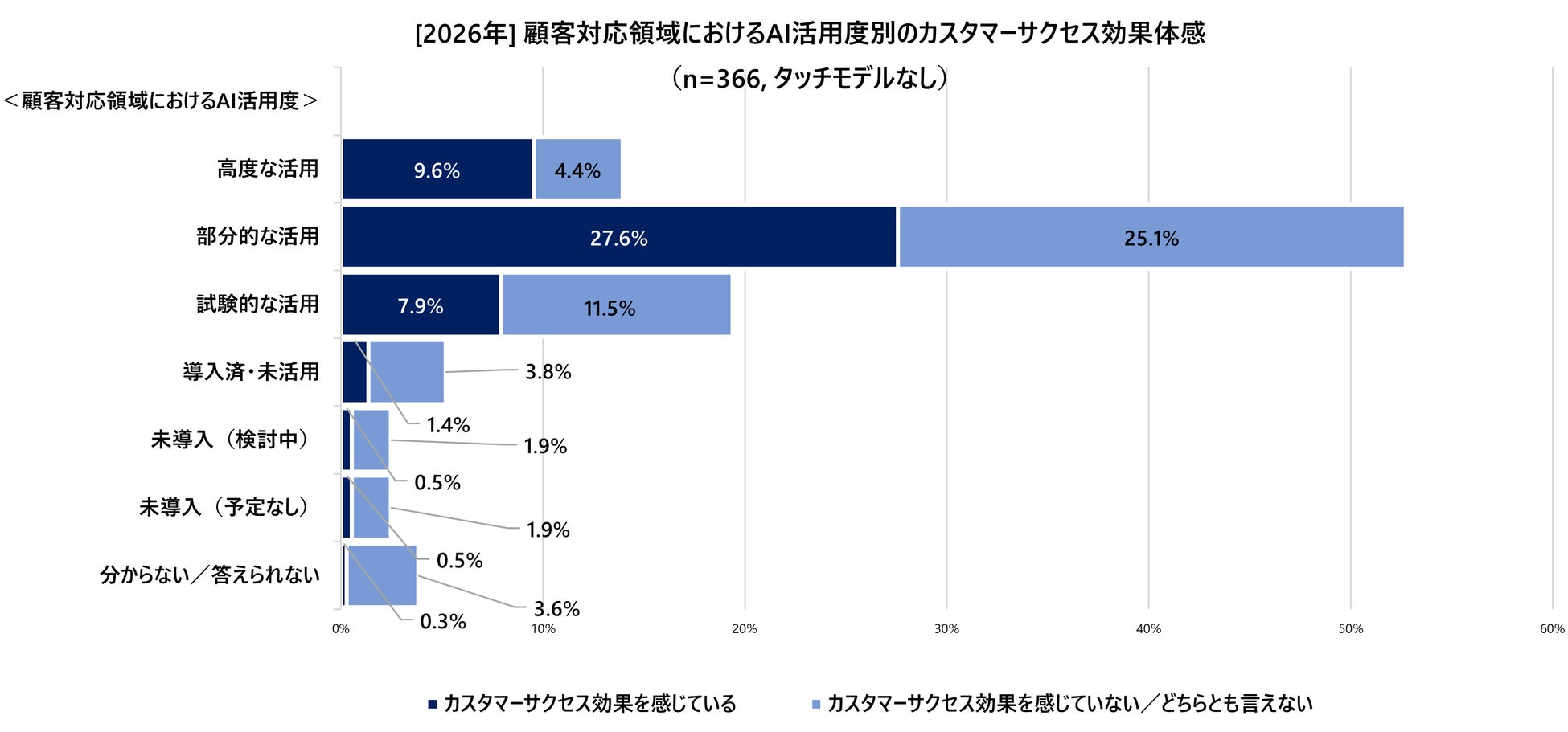 最も回答が集中した「部分的な活用」フェーズでは、明暗が分かれています。タッチモデルを構築している企業では、効果実感(36.1%)が停滞(8.3%)の約4.3倍に達しており、部分導入の段階で8割以上が成果を享受しています。
