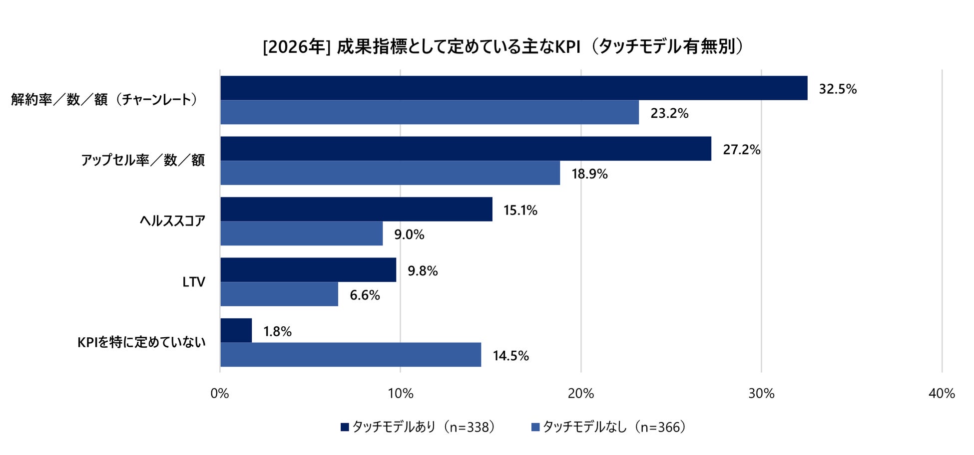 タッチモデルを構築していない企業では、基本指標である「解約率(チャーンレート)」の設定率(23.2%)すら、構築済みの企業(32.5%)と比較して低い水準にとどまっています。