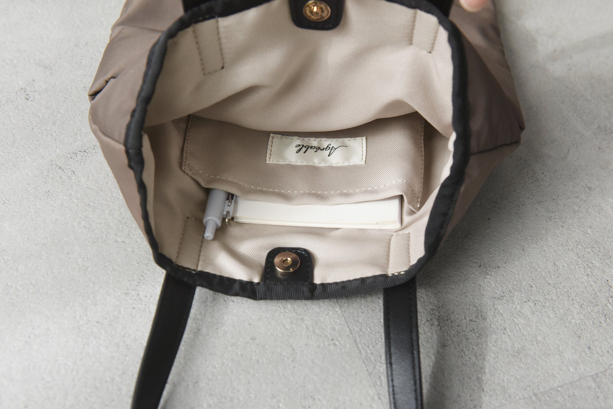 さまざまなシーンで合わせやすいように、カラーはシンプルなライトグレーベージュ、モカベージュ、チャコールネイビーの3色展開。それぞれ内側の生地がさりげない配色デザインになっています。