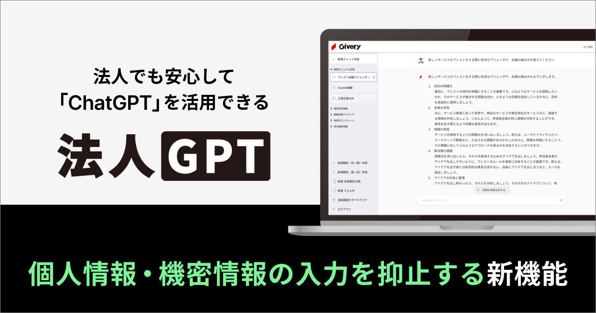 ギブリー、法人向けChatGPT活用プラットフォーム「法人GPT」に、個人情報・機密情報の入力を抑止するセキュリティ機能を新たに搭載
