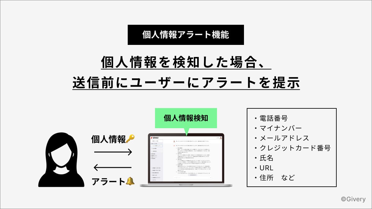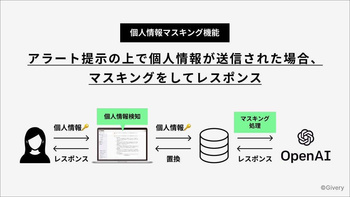 AIチャットボット、AI-FAQなどの業務自動化ソリューションを提供する株式会社ギブリー(本社:東京都渋谷区、代表取締役社長:井手高志、以下ギブリー)は、米OpenAI社が提供するGPT-4を活用した法人向けプラットフォーム「法人GPT」に、個人情報や機密情報の入力を抑止する新機能を搭載いたします。
