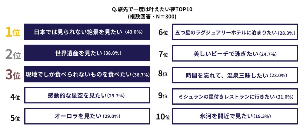 全体の43%が”旅先で一度は叶えてみたい夢”として、「日本では見られない絶景をみたい」と回答。2位「世界遺産を見たい」、3位「現地でしか食べられないものを食べたい」と続き、旅先でしか経験できないスポットや食を求めて、海外旅行へ行く人が多いことが明らかに。