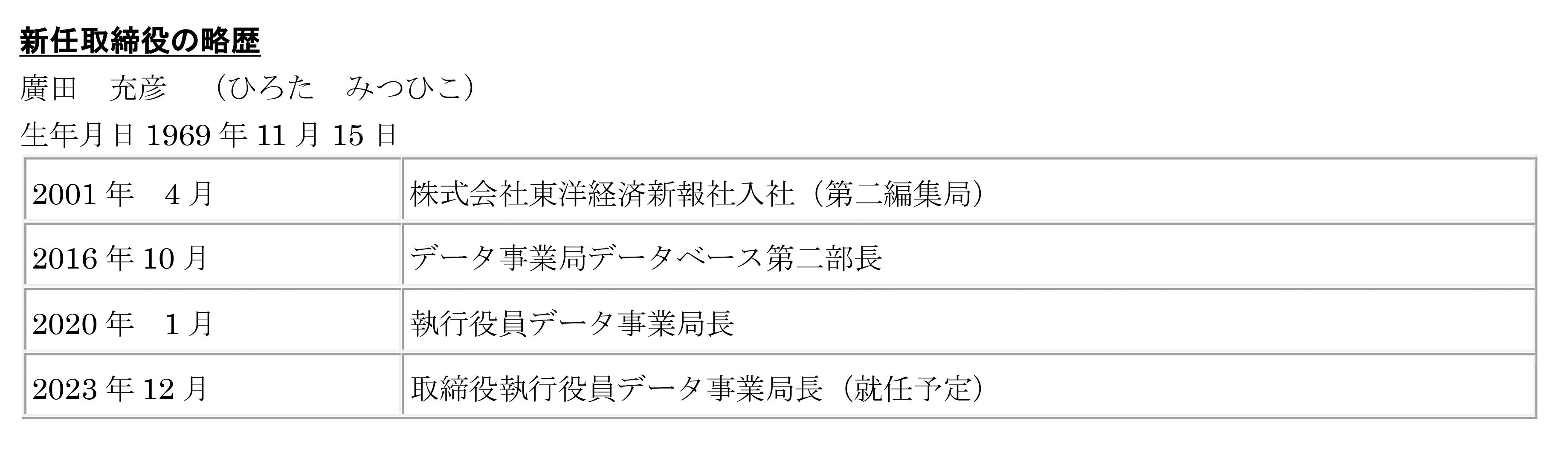 株式会社東洋経済新報社(本社 東京都中央区、代表取締役社長 田北浩章)は、2023年10月31日開催の取締役会において、第132期定時株主総会(2023年12月21日開催予定)に付議する取締役等選任議案の候補について内定いたしましたので、ご報告申し上げます。