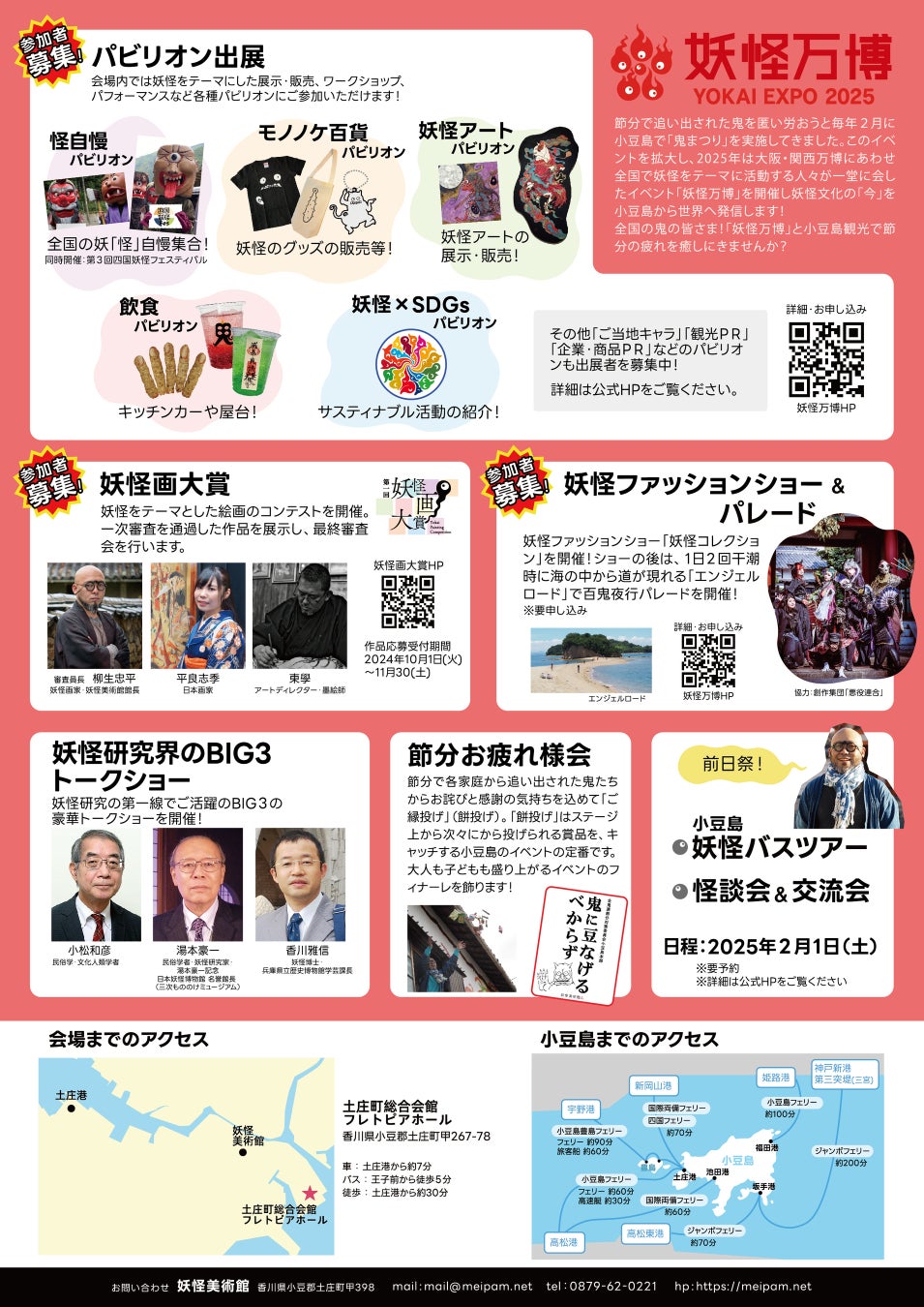 妖怪美術館では2013年から「妖怪造形大賞」というアートコンテストを合計6回開催していますが、今回は造形作品ではなく2次元(絵)のコンテストです。一次審査を通過したファイナリストの作品は2025年に小豆島で開催するイベント「妖怪万博2025」の会場に展示され、その場で最終審査会が開かれグランプリが決定します。審査員は、柳生忠平(妖怪画家・妖怪美術館館長)、平良志季(日本画家)、東學(アートディレクター・墨絵師)。