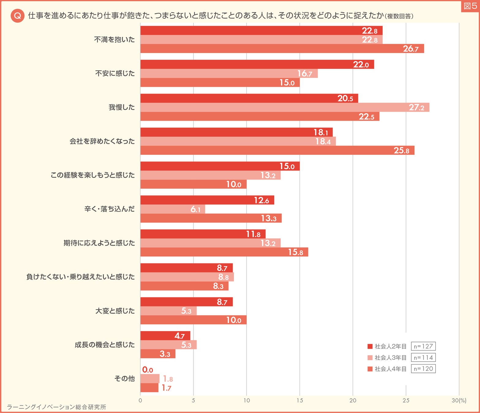 年次で比較をすると、社会人2年目、3年目では業務内容や役割が変わらないことに対して飽きやつまらなさを感じており、社会人4年目になると同じ業務が続き、知識やスキルが身についていないことに対する飽きやつまらなさを実感していることがわかりました。(図6)