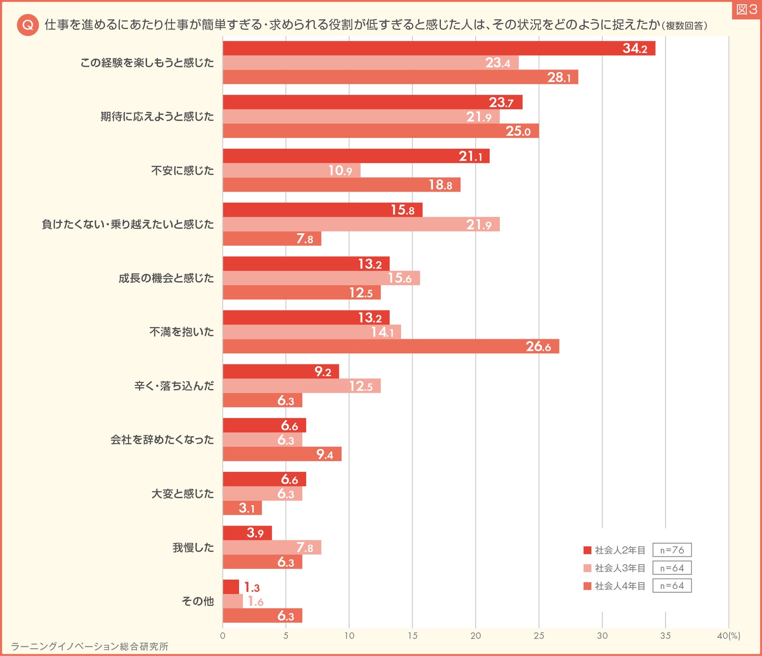 年次別に比較をすると、社会人2年目、3年目は仕事が簡単なことに対して「楽しもう」「期待に応えよう」とポジティブに捉える傾向にあるのに対し、社会人4年目では「不満」の割合が高まりました。(図3)