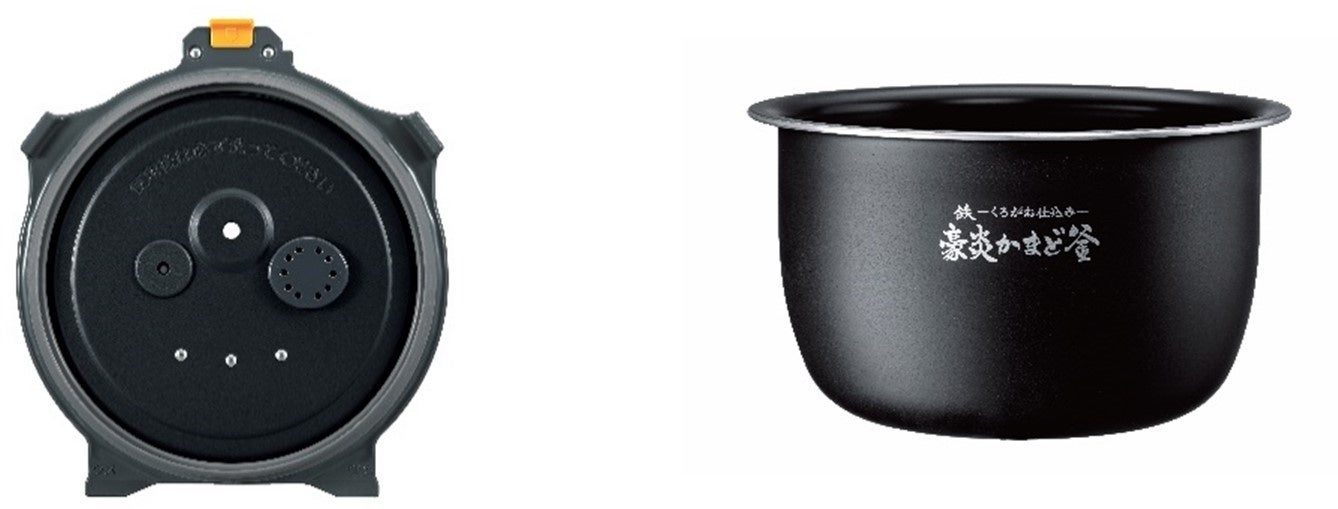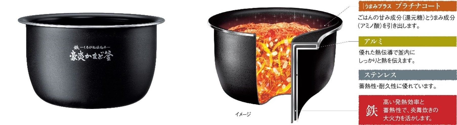 炎舞炊きに採用している「鉄(くろがね仕込み)豪炎かまど釜」は、発熱効率と蓄熱性が高い「鉄」素材を、熱伝導率の高い「アルミ」層と耐久性に優れた「ステンレス」層の間に仕込んだ象印独自の内釜で、炎舞炊きの特長である部分的な集中加熱を活かします。