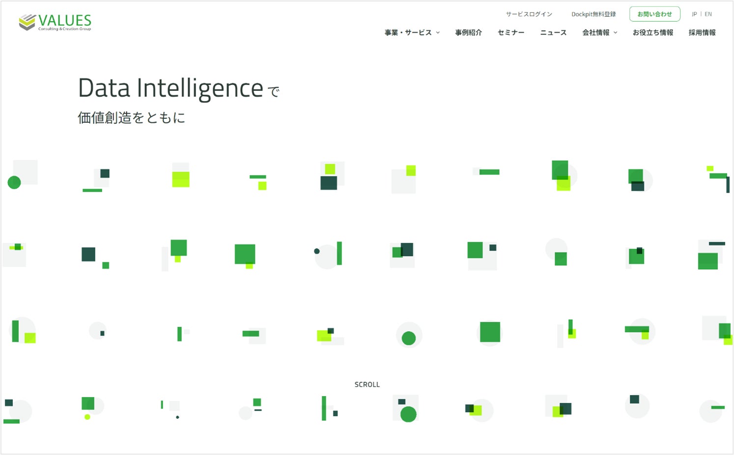 ファーストビューには新ブランドメッセージ「Data Intelligenceで 価値創造をともに」を掲げ、キービジュアルにはプランクトンをモチーフとした「データ・プランクトン」をデザイン。ごくシンプルな図形(四角形、円形)が組み合わさり、一定時間ごとに新しい様々なかたちが生まれるグラフィックとすることで、「ヴァリューズのデータとは(ただの数字ではなく)有機的な活動の集合体である」ことを示しています。