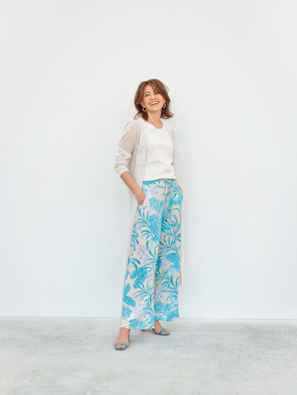 さらに今季は、デザインのバリエーションを増やし、夏を彩る爽やかなカラーや大人の女性に似合うリゾート風ヨーロッパプリントのパンツスタイルが登場。気になるウエストや腰まわりをカバーする「UVスラブ・タックスカウチョ」や、昨年のアイテムよりも裾幅を広くし、よりスタイルアップを実現した「UVスラブ・セミワイド」を販売いたします。夏のコーディネートに個性を添えるデザインでリゾートや旅先ではもちろん、お仕事やランチ、おうち時間などのデイリースタイルとしてもシーンレスに着こなせる一枚となっています。