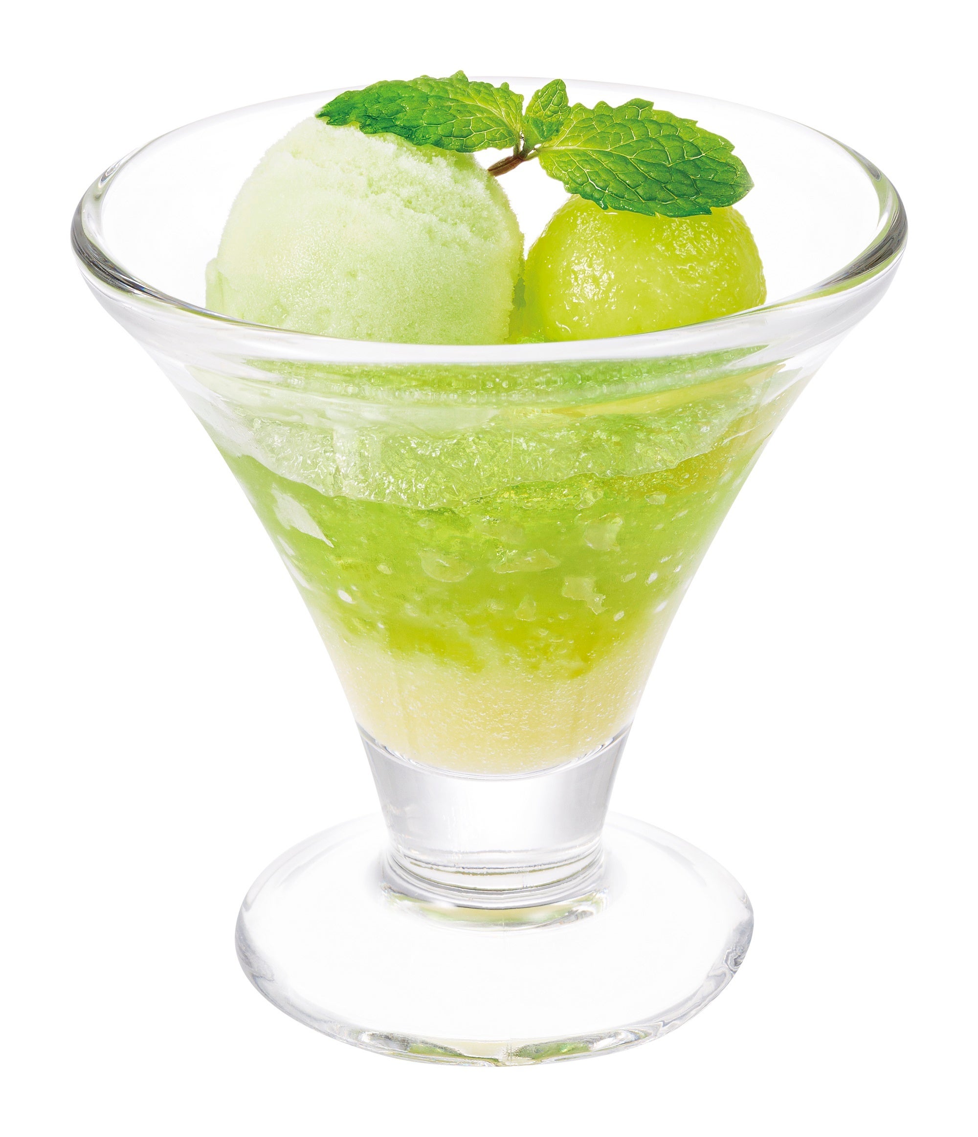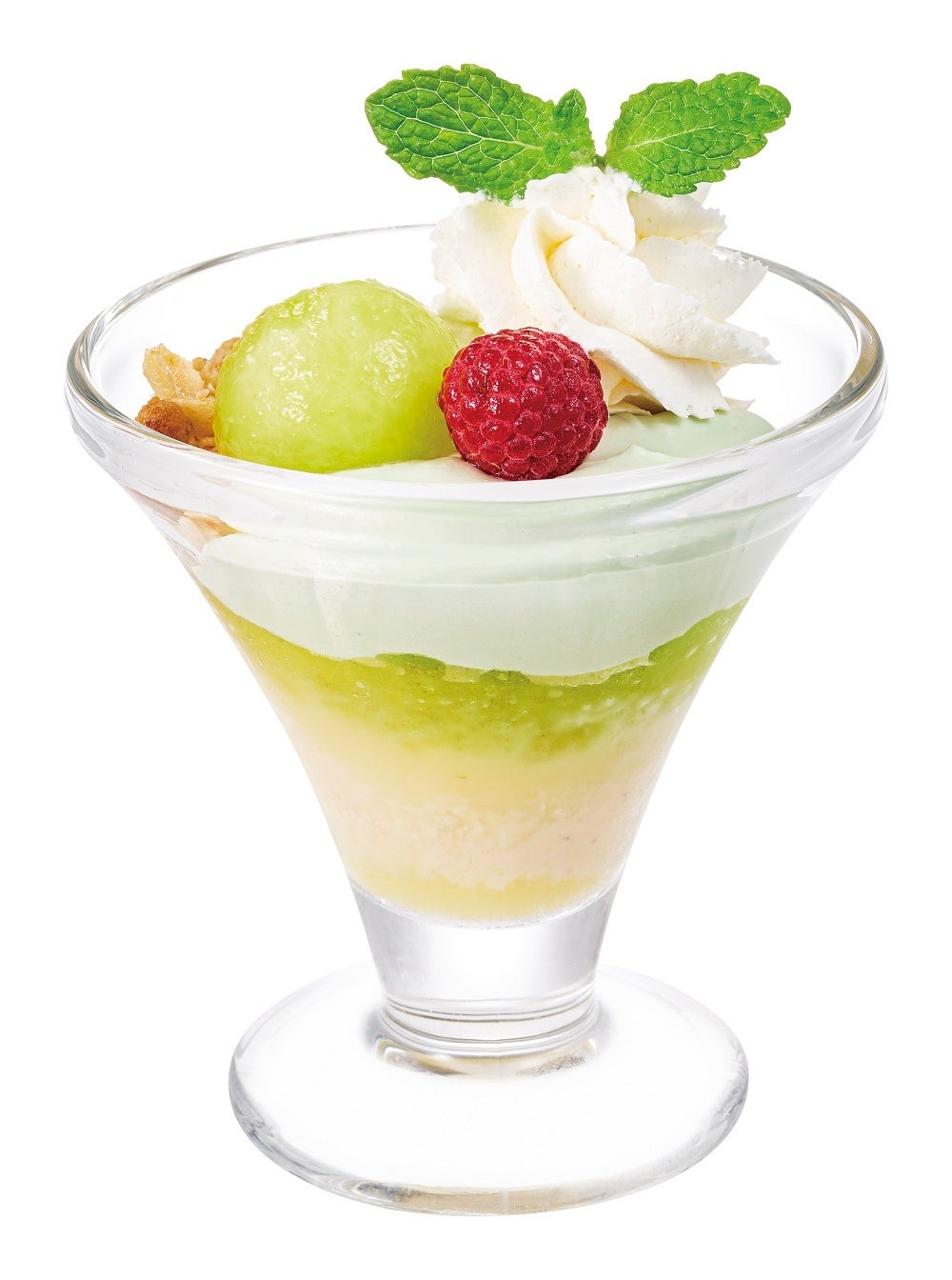に、ひんやりとしたソルベ、ふるふるとした食感のゼリー、お店で手づくりするフルーティーなソースと、みずみずしいメロンの味わいをグラスにぎゅっと凝縮しました。透明感のある淡いグリーンのゼリーが、涼しげな雰囲気