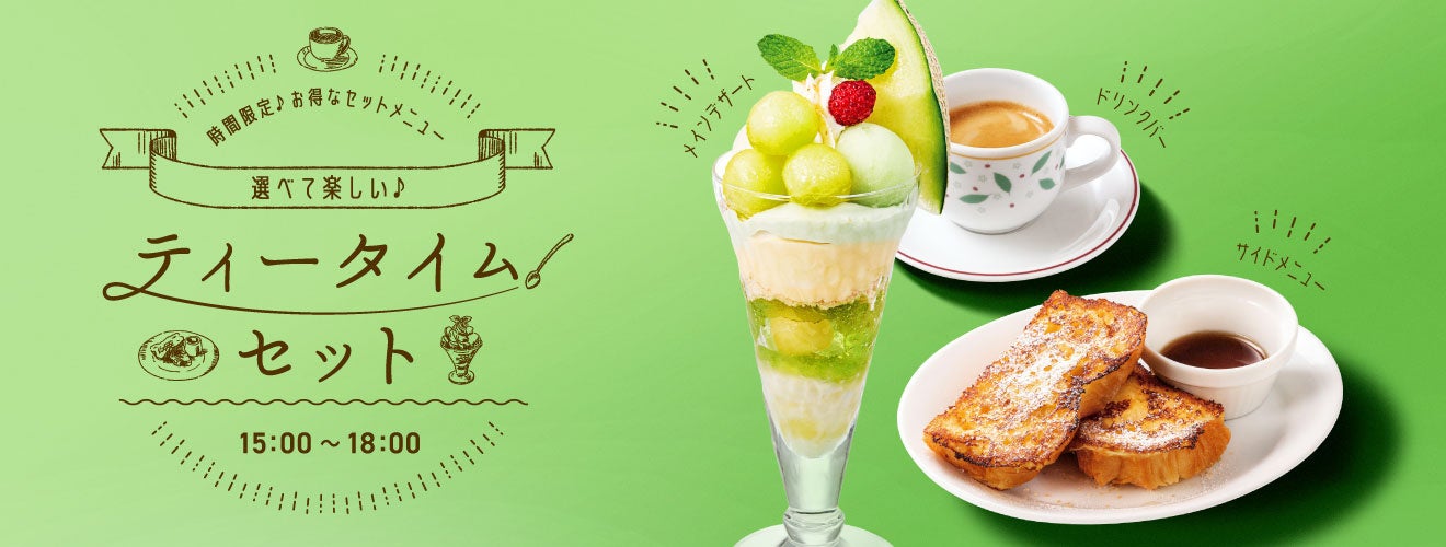 全日15:00~18:00の時間限定販売のお得なセットメニュー。マスクメロンデザート4品の中から1品+サイドメニュー6品から1品を選んで+ドリンク付きです。自分好みに組み合わせてお楽しみください。