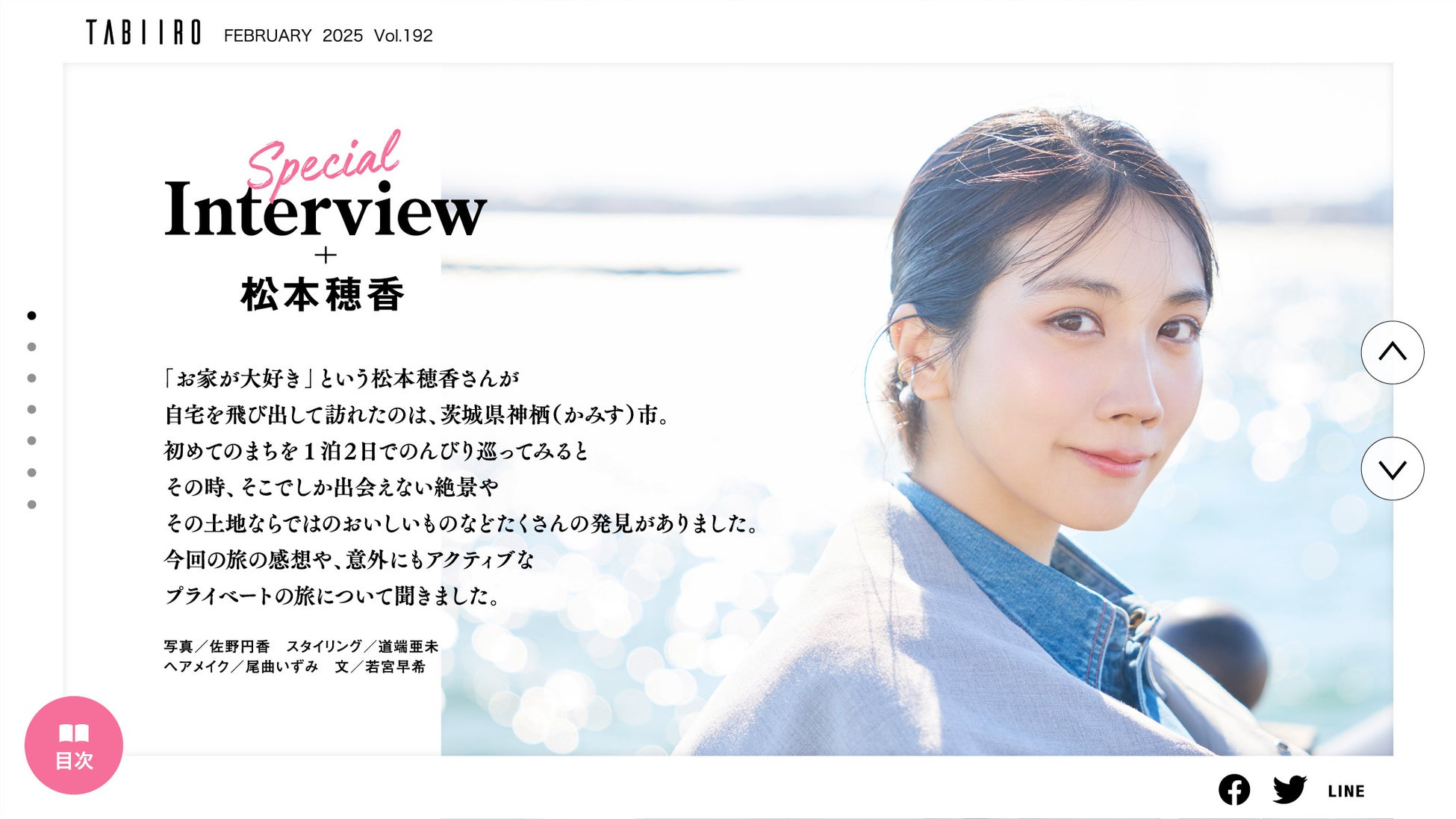 株式会社ブランジスタメディアは、表紙に松本穂香さんを迎え、茨城県神栖(かみす)市と提携し、同市を特集した電子雑誌「月刊 旅色」2025年3月号を本日公開しました。松本さんが、ドラマや映画のロケ地としてもお馴染みのフォトジェニックな神栖市を巡ります。また、いま行くべき旅先「熊本県熊本市」特集や、国内でも贅沢なリゾートタイムが過ごせるグローバルブランド「ヒルトン」を取り上げる企画、ますますブームの高まりをみせる韓国に浸れる酒場にフィーチャーした特集など内容盛りだくさんです。