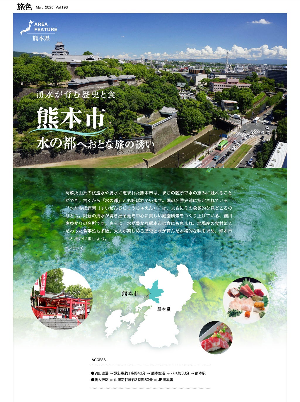 いまおすすめのエリアをフィーチャーする特集では、熊本県熊本市にスポットを当てました。阿蘇火山系の伏流水や湧水に恵まれた熊本市は、古くから「水の都」とも呼ばれています。さらに、水が豊かな熊本市は食にも恵まれ、地場産の食材にこだわった食事処も目白押し。大人が楽しめる歴史と本格的な味、そして水を求め、熊本市へと出かけましょう。