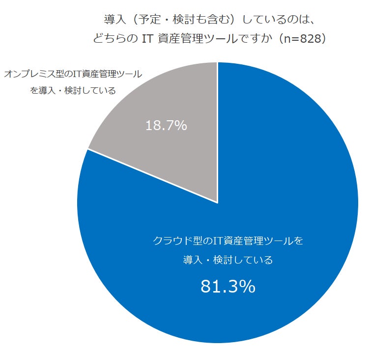 そして、「導入(予定・検討も含む)しているのは、オンプレミス型/クラウド型、どちらのIT資産管理ツールですか?」という質問では、「クラウド型(81.3%)」「オンプレミス型(18.7%)」という結果になりました。