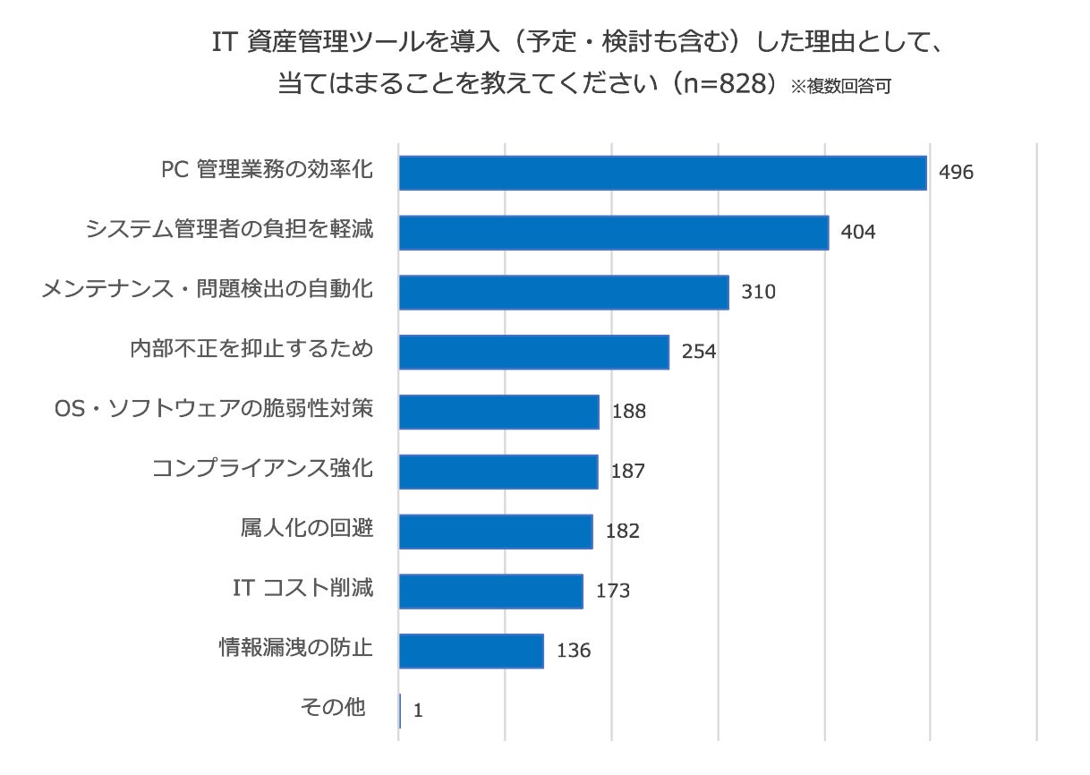 「IT資産管理ツールを導入(予定・検討も含む)した理由として、当てはまることを教えてください(複数回答可)」という質問には、「PC管理業務の効率化(回答数:496)」と回答された方が最も多く、次いで「システム管理者の負担を軽減(404)」、「メンテナンス・問題検出の自動化(310)」、「内部不正を抑止するため(254)」、「OS・ソフトウェアの脆弱性対策(188)」という理由が続きました。