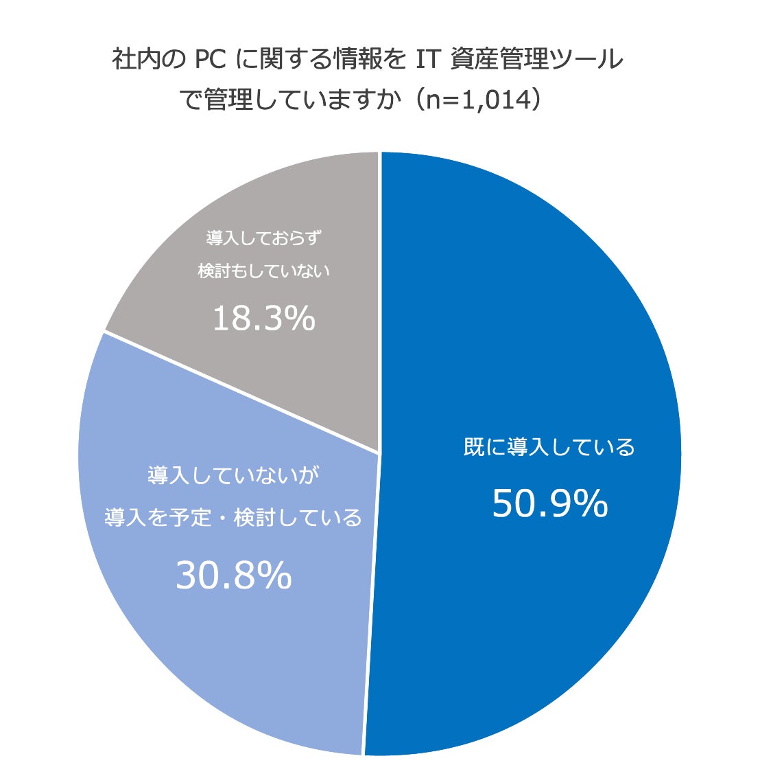 「社内のPCに関する情報をIT資産管理ツールで管理していますか?」という質問には「既に導入している(50.9%)」と回答された方が最も多く、次いで「導入していないが、導入を予定・検討している(30.8%)」、「導入しておらず、検討もしていない(18.3%)」という回答結果になりました。