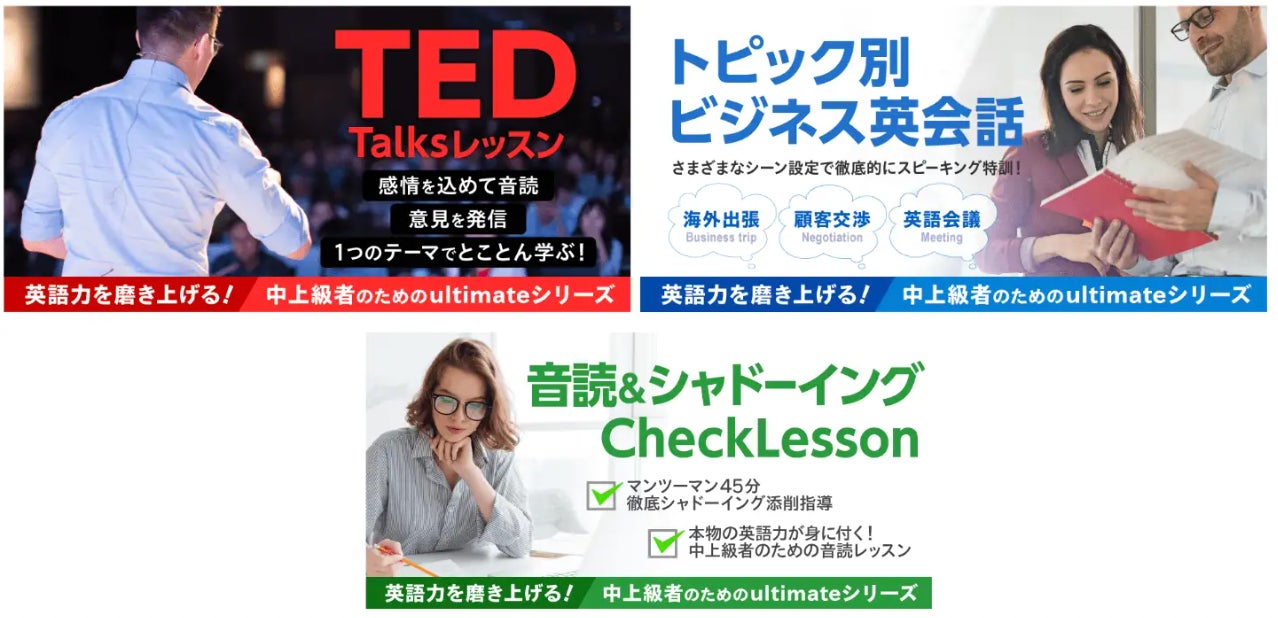 新たに中上級向けの3コースがラインナップ。英語学習者に大人気のTED Talksを使って、音読特訓からディスカッション、プレゼン練習をとことん行うTED Talksレッスン、顧客交渉や英語会議などリアルなシーン設定で状況説明やディスカッション課題を行うビジネスシーン別英会話コースなど、中上級者向けのレッスンが充実しました。初めてのビジネス英会話からより実践的な英会話まで、あなたのレベルに合わせて英語を学ぶことができます。どのコースからスタートすべきか、無料カウンセリングでスタッフがご案内しますので、まずはカウンセリングにご予約ください。