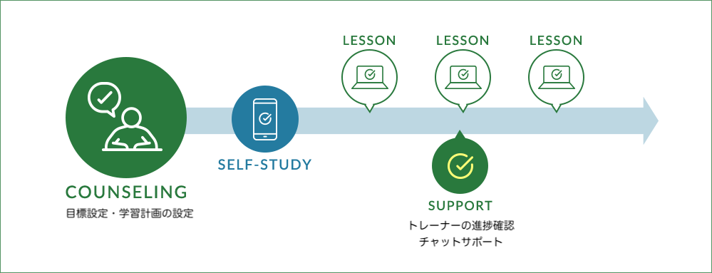 専任のトレーナーが、過去の学習を振り返り、学習の目的を明確にし、目標を決めてから1ヶ月の学習をスタートします。1ヶ月の学習計画を立て、アプリでの学習内容やレッスンを選択していきます。