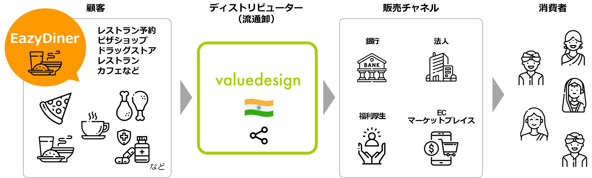 なお、Valuedesign Services Private Limitedが保有する独自の流通ネットワークは、ディストリビューションパートナーの拡大により、現在インド国内約5億人の消費者へリーチ可能となっています。本ネットワークに紐づくデジタルギフト提供パートナーとして、EazyDinerをラインナップに追加し、さらなる拡充を図ります。