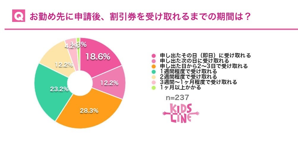 次に、「割引券を受け取れるまでの期間」に関しては、割引券の申請から受け取りまでに時間がかかることが課題となっています。調査では、職場から即日で割引券を受け取れると回答した人はわずか18.6%にとどまり、急な残業や子どもの体調不良などの突発的なニーズには割引券が利用できていない家庭が多数存在することが明らかになりました。