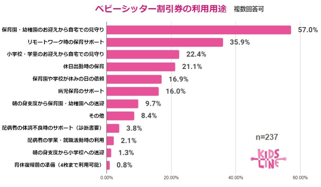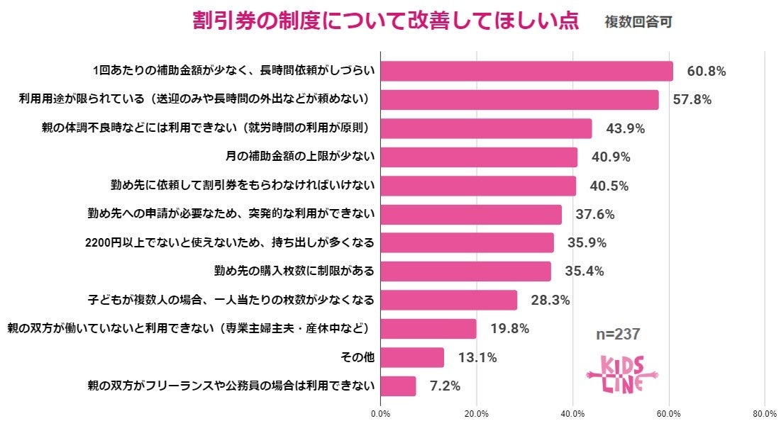 全国47都道府県で24時間スマホで呼べるベビーシッターサービス「キッズライン」を運営する株式会社キッズライン(本社:港区六本木/代表取締役社長:経沢香保子)は、「こども家庭庁企業主導型ベビーシッター利用者支援事業」に関するアンケート調査を2024年10月25日~10月29日の期間で実施いたしました。ベビーシッター割引券利用経験のある237名が回答した調査では、補助額の増額や利用用途の拡大を求める声が多く寄せられました。