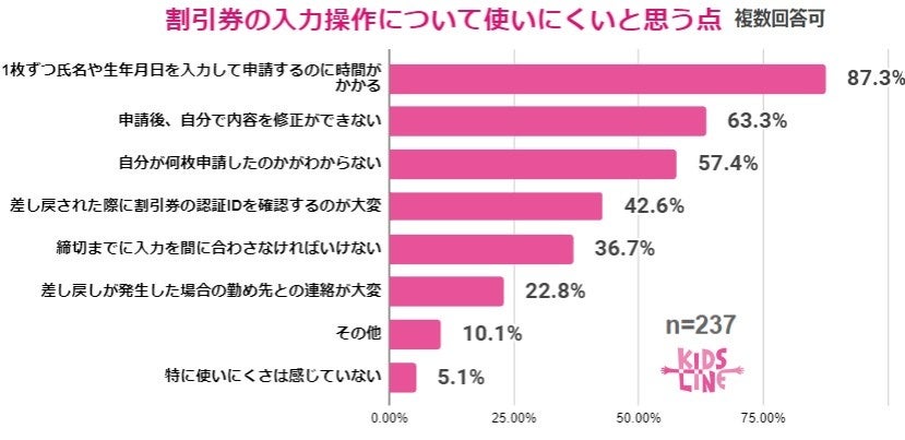●子どもの情報は変わる訳ではないのに毎回入力しなくてはいけない。また自分で修正ができないため慎重な入力が必要で、とても時間がかかります。1枚ずつに別々のリンクが発行されることも、何枚使用したのか分かりづらく、管理・入力にも時間がかかっています。(熊本県/30代女性)