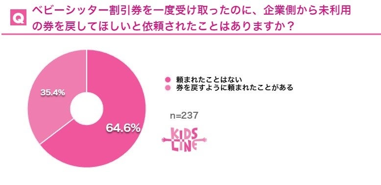 さらに、「勤め先に戻してほしいと言われたことがあるか」という質問では、35.4%の利用者が一度受け取った割引券を勤め先から返却を求められた経験があると答えています。これは企業規模によって割り当てられた購入枚数制限があるために、従業員の要望に応じて適切に割引券の受け渡しができていないことを示しています。