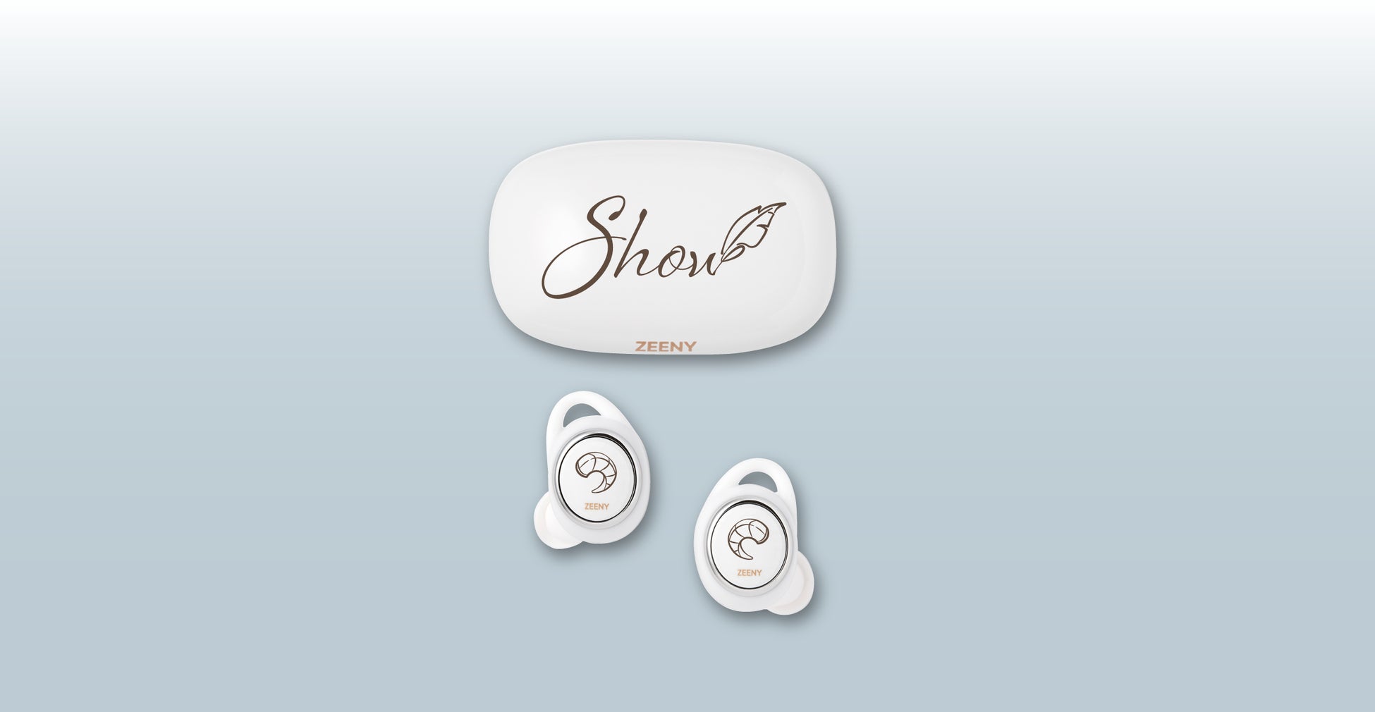 コラボレーションイヤフォンには録り下ろしシステムボイスを搭載。パッケージには「狩野翔」さんが考えた羊のキャラクターを使用し、イヤフォンケースには羽があしらわれた名前のロゴ、本体には羊のツノをデザインしました。