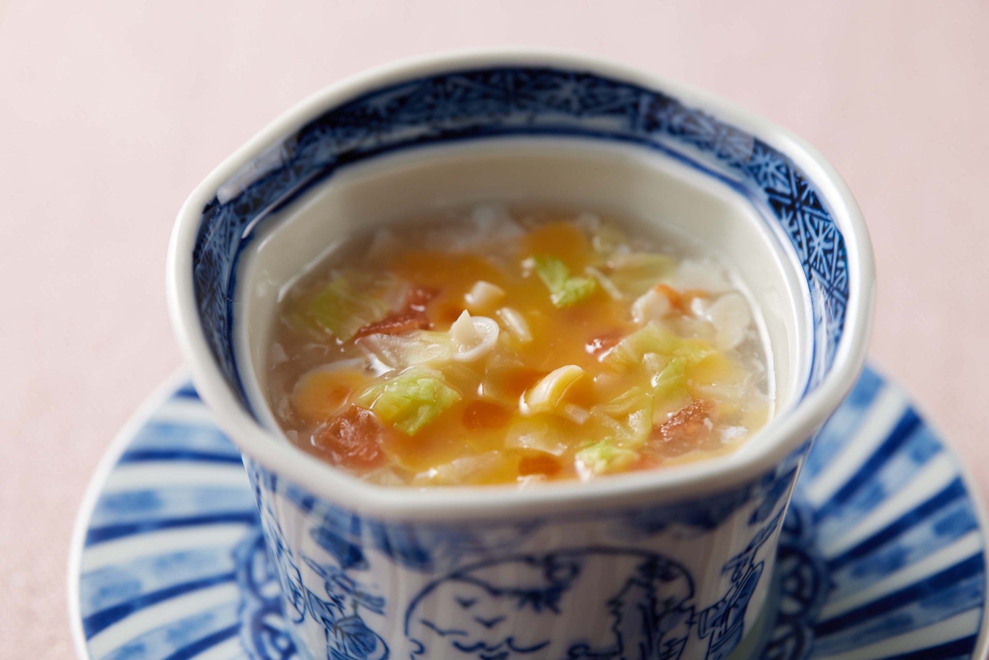 甘みのある春キャベツと酸味のあるトマトを使用。さらに自家製塩卵で塩味を溶いた塩味と酸味のバランスがさっぱりと感じる中華スープです。