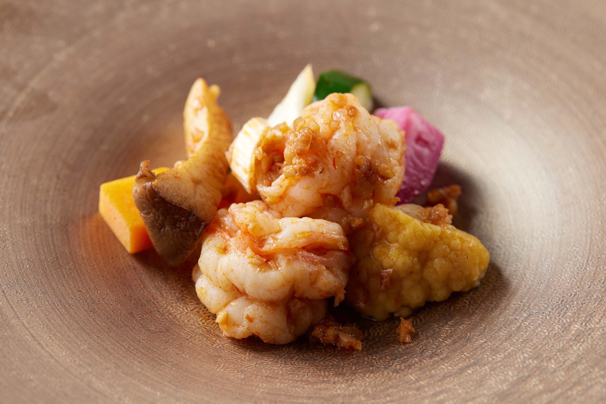 干し海老やレモングラスなど中東系の香辛料を使用した醤で大海老と春野菜を炒めることで、ピリッとしながらもしっかりコクを感じることができます。