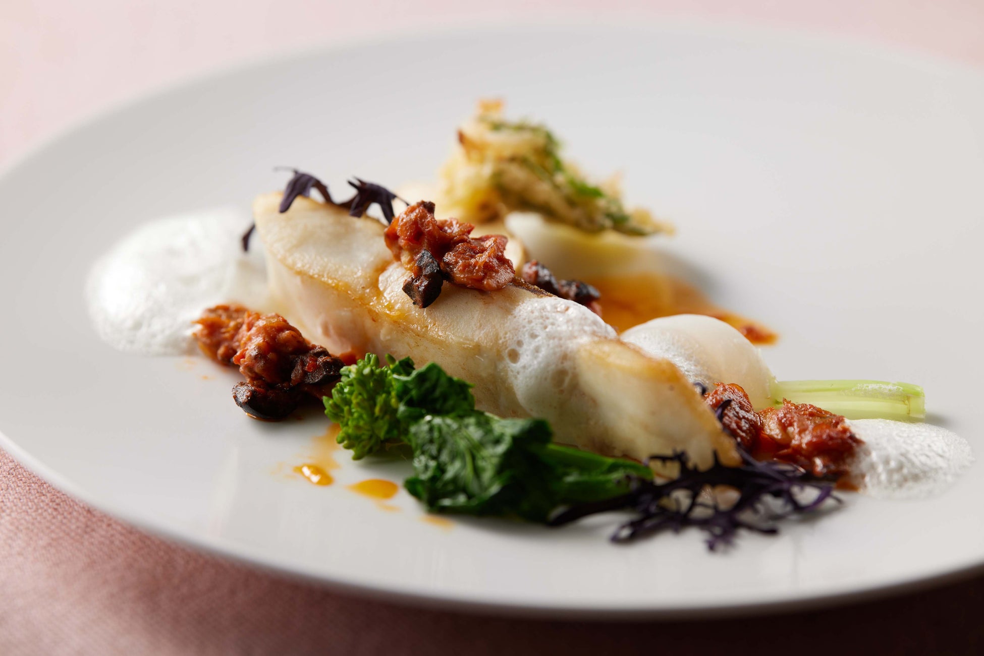 ふわふわ食感に焼きあがったポワレを泡状の白ワインソースでさらに柔らかい口当たりに仕上げました。付き合わせの煮込みと香草と新玉葱のベニエとともにお楽しみください。