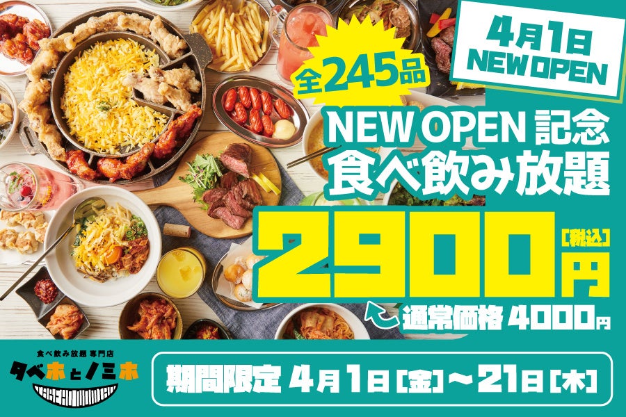 【食べ放題&飲み放題の専門店『タベホとノミホ 松山二番町店』グランドオープン】4/1~21の期間限定で全245品の食べ飲み放題コースが2,900円となるオープン記念キャンペーンを実施!